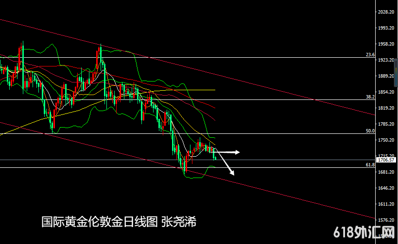 终有所触底反弹,收于1711.75美元,日振幅26.8美元,收跌19.21美元,跌幅1.1%。