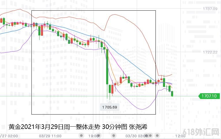 不过由于10日均线的初步压力,加上苏伊士运河的堵船有解除迹象而减弱避险情绪,使得金价再转走低,并延续至欧盘尾虽有所反弹,但在美盘开盘后,美元保持走强和美国国债收益率大幅上升,市场对美国经济迅速复苏的押注也令金价承压,另外苏伊士运河恢复通行也令市场情绪缓解,金价就此迅速下挫,于22点整在跌破中轨支撑的同时,也录得日内低点1705.91美元,也即逾两周低点。