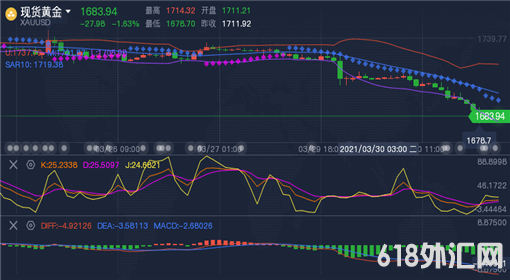 周一(3月29日),国际金价下跌,因美元指数上升,而且随着经济复苏和疫苗接种率提高,投资者对风险资产的偏好增加,这削弱黄金的避险地位,现货黄金短线仍下看1674美元。美元本周开局持坚,因美国经济复苏和疫苗接种进展快于其他发达国家,吸引投资者涌向美元。美国有可能推出数万亿美元财政支出,支撑全球经济成长前景。美国商品期货交易委员会(CFTC)上周五公布,截至3月23日当周,对冲基金及资金管理公司提高其纽约商品期货交易所(COMEX)黄金的多头仓位。不过美国2月消费者支出录得10个月来最大降幅,因寒流席卷美国许多地区,且第二轮援助支票对中低收入家庭的提振作用消退。这限制了金价下行步伐。