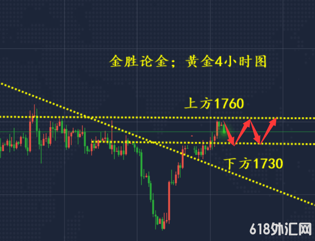 黄金从四小时来看,当下价格上线遇阻后回落,出现这种形态,预期会出现两种情况,一是小幅回落直接拉升,形成冲高回落,二是金价经过拉升,对于均线来说直接大幅拉升时间不够,日线上方重点压制在1760这里,而四小时图预期会反复二到三K线,从横向到纵向来看,价格回抽太深就直接影响上升的延续性,所以对于预期回落1745就是比较理想的多单入场点。综合来看,黄金今日操作思路上金胜建议以回调做多为主,反弹高空为辅,上方重点关注1750一线阻力,下方短期重点关注1730一线支撑。