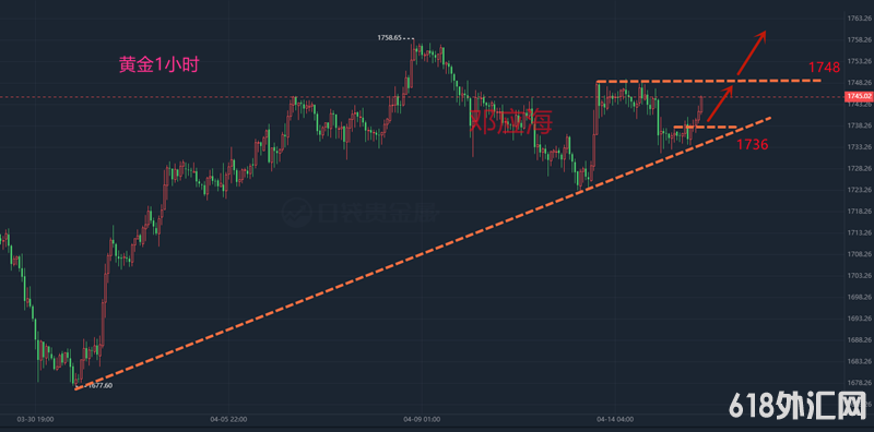 日K线金价早盘回落止步中轨支撑,符合笔者的预判,K线踩着中轨规律性上行,中轨就是楚河汉界,在没有跌破之前,老老实实干多。有朋友有疑问,要是跌破了呢,我的回答是,跌破了再说,没破之前就既可能是诱空。4小时K线遇均线支撑,MA6再次拐头向上运行。小时线布林线走平,开始拐头向上运行,K线站稳中轨上方。所以,黄金欧盘回落继续干多,1738-36区域进场,目标先看昨高1748一线,突破继续看前高1758附近。