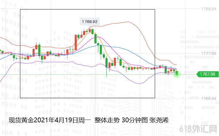 张尧浠:美债收益率回升增强、黄金短期见顶续看回落 上交易日周一(4月19日):国际黄金伦敦金冲高至逾七周高位后回落收阴,且收取较长上影线。这暗示本周后市有短期见顶回落连续性风险。 走势上,金价自亚市开于1775.21美元/盎司,早盘现10美金左右的冲高回落震荡,后窄幅运行至盘尾从开盘价一线再度起涨,到欧盘时段18点整左右录得日内高点1789.81美元的预期位置,之后走势开始连续下滑回撤,延续至美盘初21点录得日内低点1766.70美元,最终有所止跌回升,再度窄幅震荡运行,收于1771.22美元,日振幅23.11美元,收跌3.99美元,幅度0.22%。