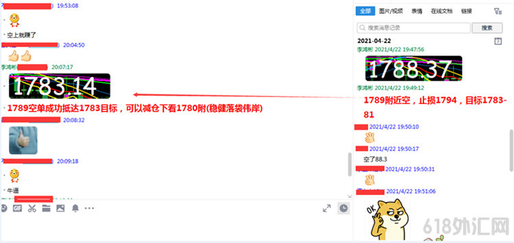 4.23黄金一大早布局的1789空,成功抵达目标1783获利出局。
