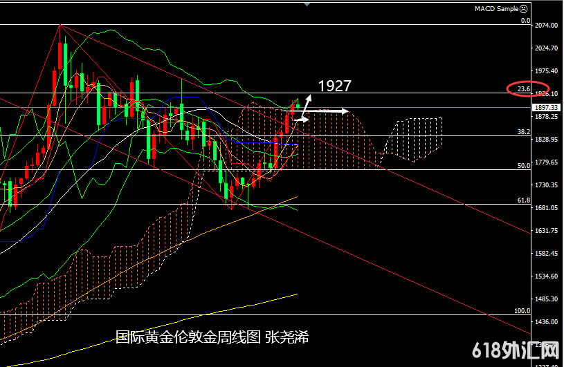 周线级别,金价续4周连阳后,本周先行走高后遇阻回落,多头力量有所减弱,MACD保持看涨,KDJ有所减弱,但趋势仍看涨,整体仍运行在云层之上,均线金叉看涨预期强劲,仍有上涨的空间,上方关注1916美元附近阻力,以及1927美元阻力。下方关注1890美元,以及1877美元支撑。