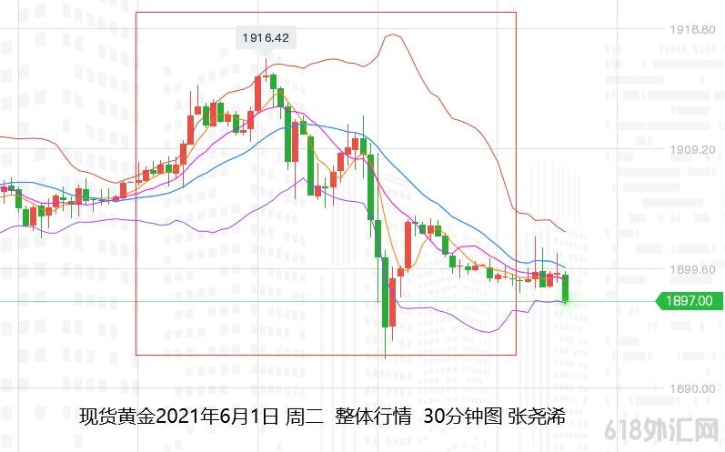 走势上,金价自亚市早盘开于1907.34美元,受到美元指数的再度走低影响,以及5月强势收涨的动力推动,先行走高,于亚盘尾录得给出的初步阻力目标位附近,也即当日高点1916.39美元,随后行情有所遇阻回落,美元指数触底反弹对其造成压力;
