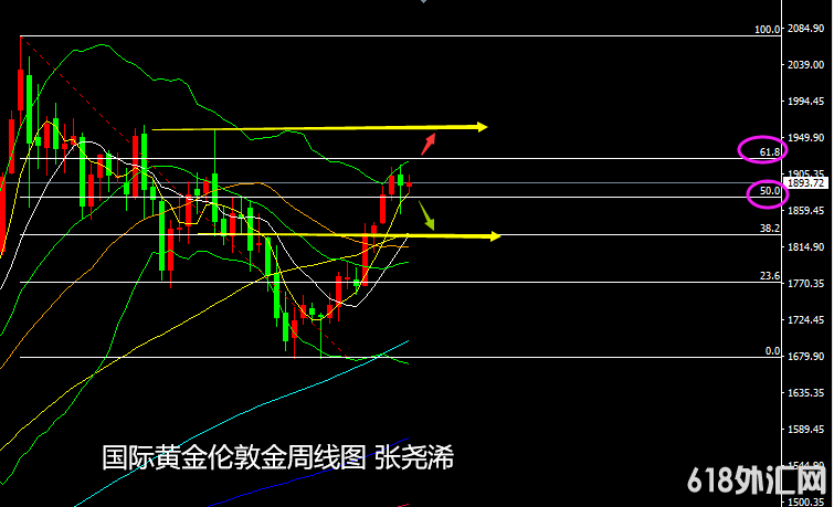 技术上;周线级别:金价维持在50%回撤线上方震荡运行,价格之上近期也面临上轨以及61.8%回撤线压力,根据其附图指标看,有一定的触顶回落预期,但整体行情仍在其两回撤线之内,方向暂时难明,关注其上下破位情况,上破阻力线则进一步看涨1960美元乃至2000美元关口,下破支撑线则进一步看至1830美元乃至1770美元附近。