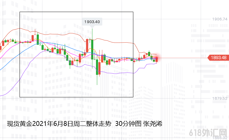 后因技术支撑,美国4月职位空缺数创下纪录新高,美债收益率的日内持续走低表现而支撑其再度反弹,一直到美盘开盘后录得日内高点1903.36美元,但因世界银行对于美国2021年经济增长率高于1月份的5.5%为6.8%报告,令美债收益率迅速反弹,市场也突现超6亿砸盘影响,令金价又很快下落迅速刷新白盘低点,录得日内低点至1883.98美元;
