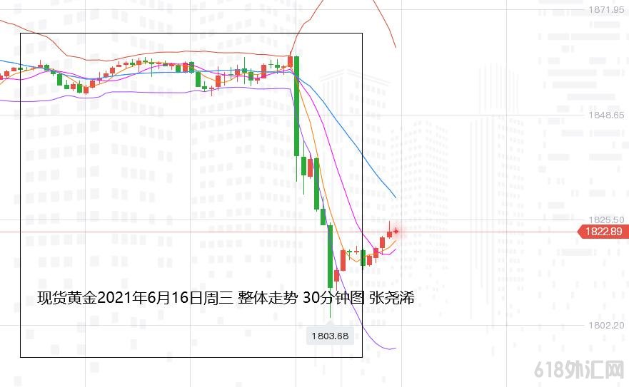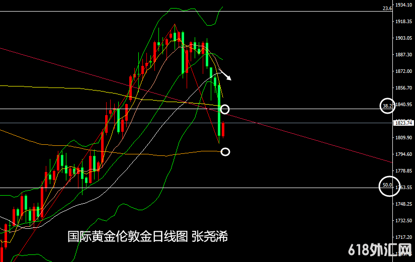 打压金价自日高点1862.95美元即刻重挫连续下行,且连破100日均线及38.2%回撤线支撑,并一度跌破60日均线创5月6日以来新低至1804.24美元/盎司,最后有所止跌反弹,并收于1811.76美元,日振幅58.71美元,收跌47.21美元,跌幅2.54%。