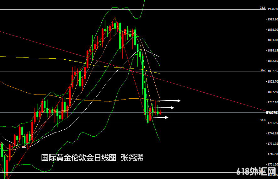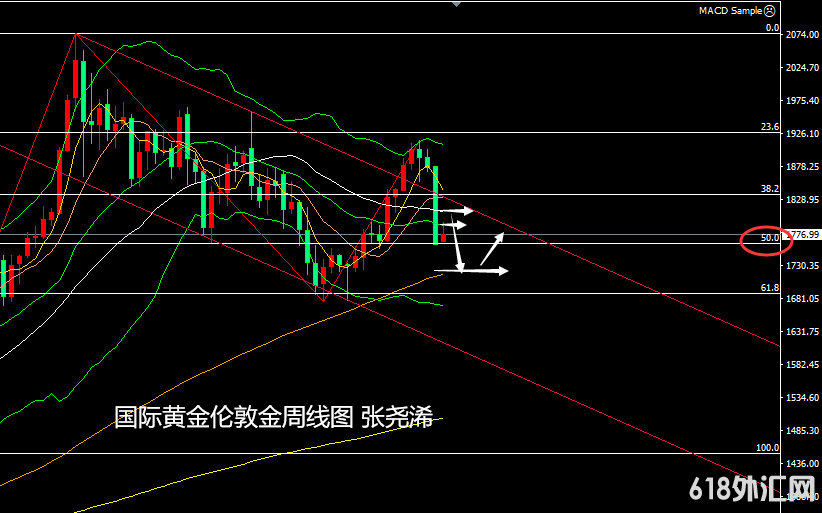技术上:周线级别:金价本周虽开盘即走高,但仍在触及中轨上方后面临压力受阻,好在也未回落抹消掉本周的涨势,至少能证明50%回撤线支撑仍然强大,且在此之上仍有看涨预期。但附图指标KDJ和MACD依然处于较强的看空信号中,暗示仍不排除有回落的风险。所以相对于日线级别的偏涨信号,仍有遇阻回落的看空机会。