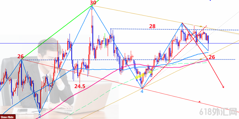 白银前期两次上攻30关口都迎来大幅回撤,上方形成平头顶形态,最低触及23.8低位,只不过短期处于周线布林三轨28-23区间运行,只有跌破22关口那么M顶形态成立!近期白银跟随黄金出现了回落,冲高受阻29关口出现了回落,28高位震荡临近前高,受压下破27关口,徘徊在26附近,和李鸿彬预期走势一致。现在日线MA5-MA10死叉下行,勉强运行在200日均线上方,不过MACD绿柱能延续放量状态,代表空头还有下行空间与动能。预期在26关口徘徊了那么久,空军蓄力有进一步下行风险,操作上顺势空。