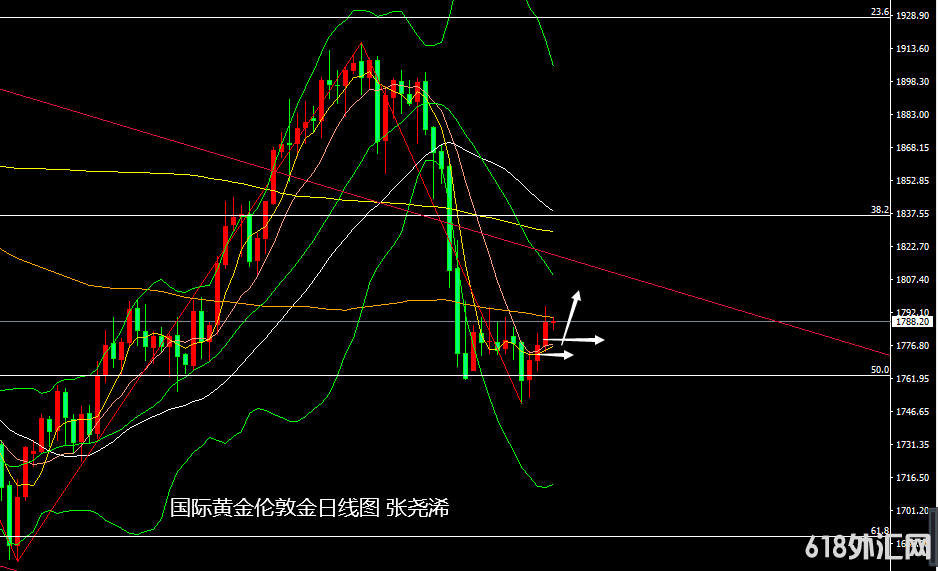 周线级别:金价上周探底回升以长脚下影线收阳,为本周增加了看涨预期,不过目前走势仍处中轨阻力测试阶段,上方也面临5周及30周均线压力,因而本周反弹聊空间有限,但如突破中轨压力,回落预计也是到下周走出,本周仍以突破阻力测试30周均线为目标。下方我们依然重点关注50%回撤位处的1762美元附近支撑,以及100周均线附近上方,以此保持趋势看涨。