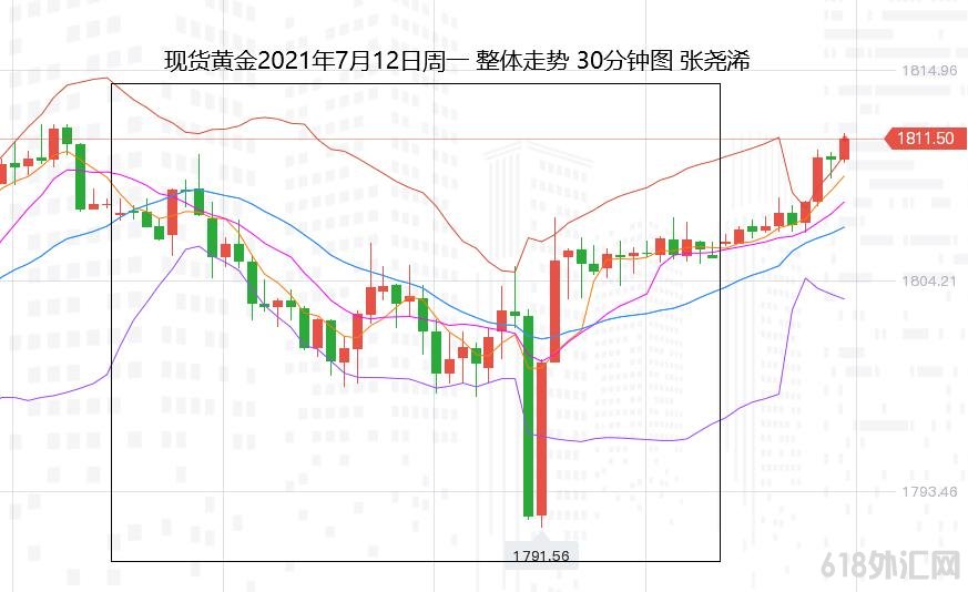 张尧浠:市场瞩目美CPI、黄金坚守百日线上方觊觎看涨 上交易日周一(7月12日)国际黄金伦敦金探底回升收阴锤。 走势上,金价自亚市早盘开于1807.73美元/盎司后,先行延续上周五的反弹力量走高并录得日内高点1810.69美元,但因技术上2075美元而下的趋势线压力,以及基本面上,市场对美联储马上将宣布缩减政策仍相当忌惮,而打压金价转跌,欧盘整体虽在千八上方震荡,但美盘21点整到-22点半左右,COMEX最活跃黄金期货合约陆续出现数个大单砸向市场,令金价迅速下跌录得日内低点1791.57美元,后又迅速反弹至日内开盘价附近,同时美元指数较日内高点明显回落,对金价产生支撑,终收于1805.72美元,日振幅19.12美元,收跌2.01,幅度0.11%。