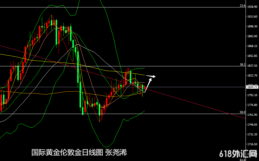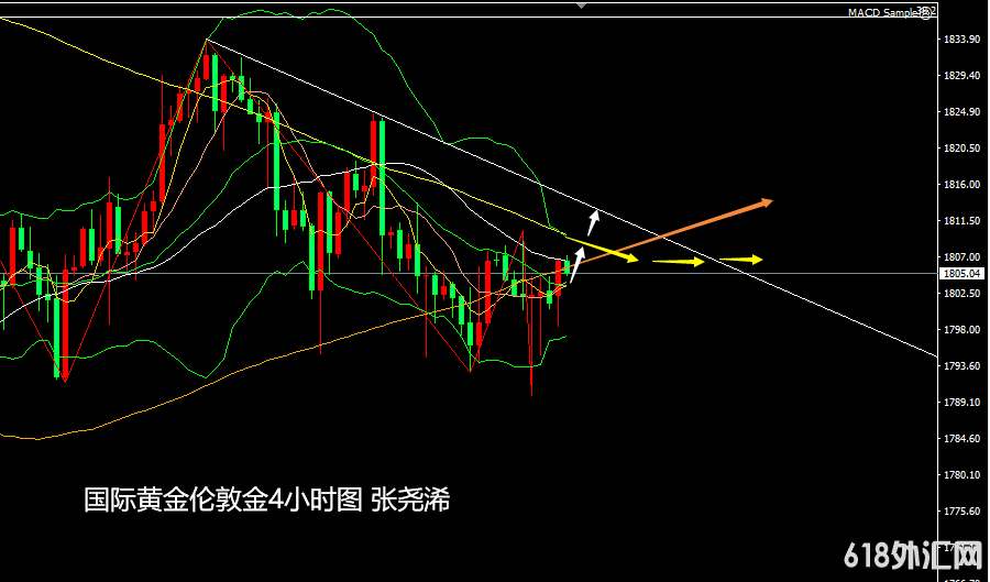 较长的观点看法,还是上周一直说到的4小时级别分析,100周期线已经明显走出上行趋势,相对冲击200周期线形成金叉看涨的概率较大,如有较大回落,得先反弹刷新1834美元高点,目前上方关注200周期线阻力以及1834美元而下的短期回撤压力。
