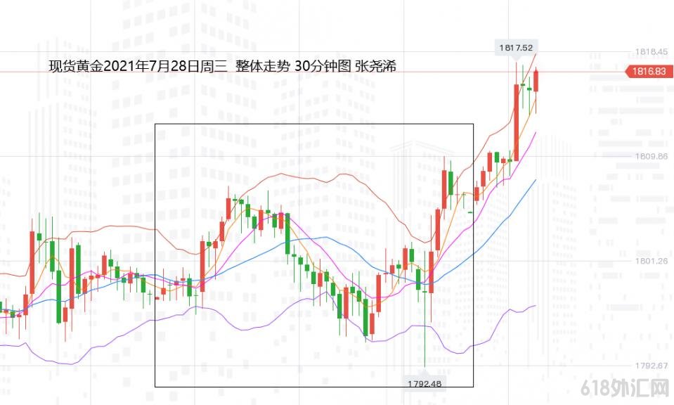 之后,周四凌晨两点,市场重磅等待的美联储利率决议维持基准利率不变,但声明称经济已朝缩减QE取得进展,这符合市场偏鹰预期,打压金价迅速跌至1792.37美元日低点;