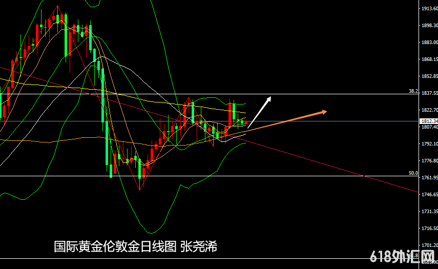 日线级别:金价近期仍维持在1790-1835美元之间震荡运行,日内来看,上方200日均线为较强阻力,下方100日及30日均线为较强支撑,触及可短线多空操作。