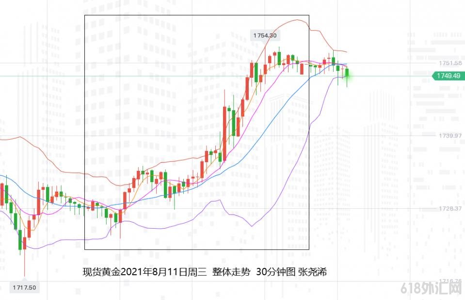美国公布的通胀数据消费者物价指数(CPI)放缓,缓解了市场对美联储将提前缩减经济支持措施的担忧。这打压美指及美债迅速双双回落,并支撑金价创出三个月最大涨幅,同时也录得日内高点1754.13美元,验证了晚间通知1730入场多单的目标位。最终触及5日均线压力有所遇阻,终收于1751.24美元,日振幅30.14美元,收涨22.33美元,涨幅1.3%。