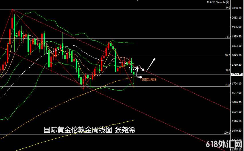 技术上,周线级别:金价继续延续本周一触底后的回升之力,目前虽未完全收复跌势,但也暂回归至100周均线上方,暗示多头已占据些许优势,如周尾能收线于此上方,则加大反弹力度,另外也从周一低点来看,正是触及1451-2075美元升势的斐波拉契61.8%回撤线支撑位置,同时还和3月份低点形成较强的双底支撑看涨形态,故此周线级别仍存在较大的反弹空间和预期。