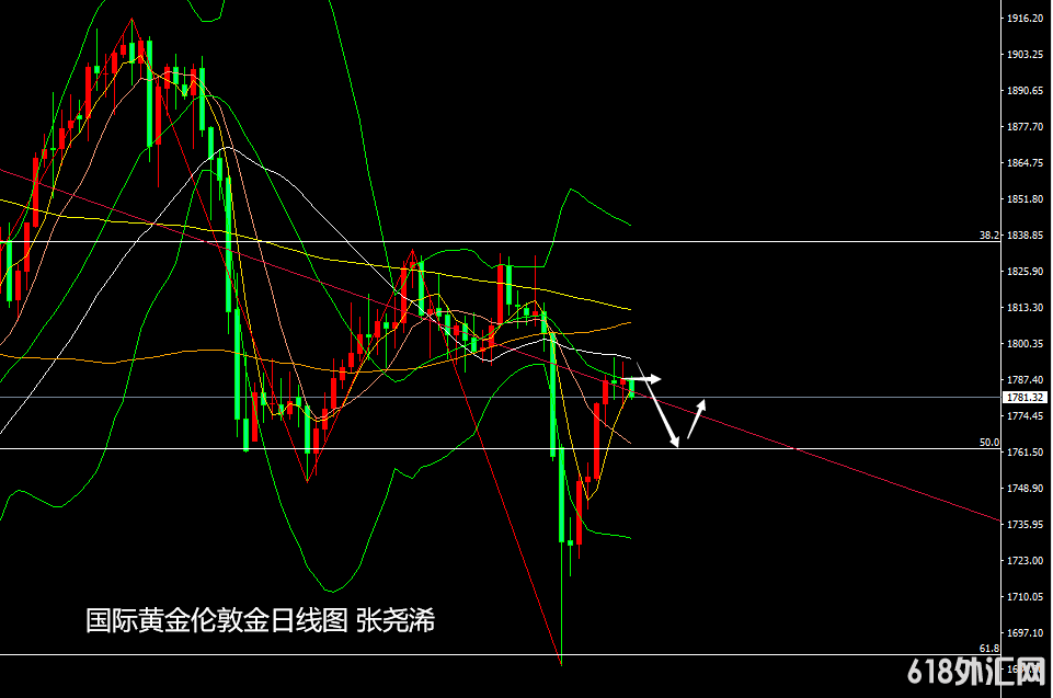 具体走势上,金价自亚市早盘开于1786.01美元/盎司后,在美指自隔夜反弹高点附近有所遇阻回落支撑下,先行反弹走强,于盘尾收盘录得日内高点1793.61美元;