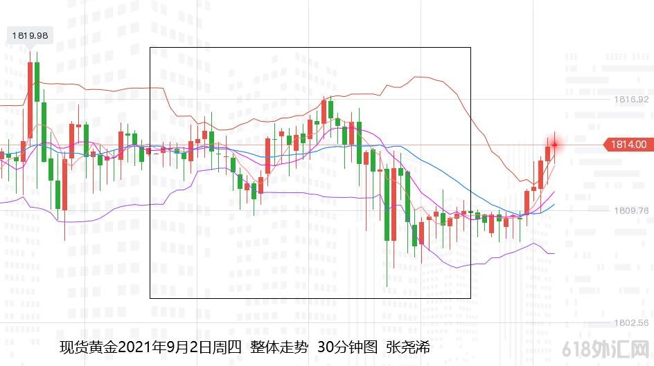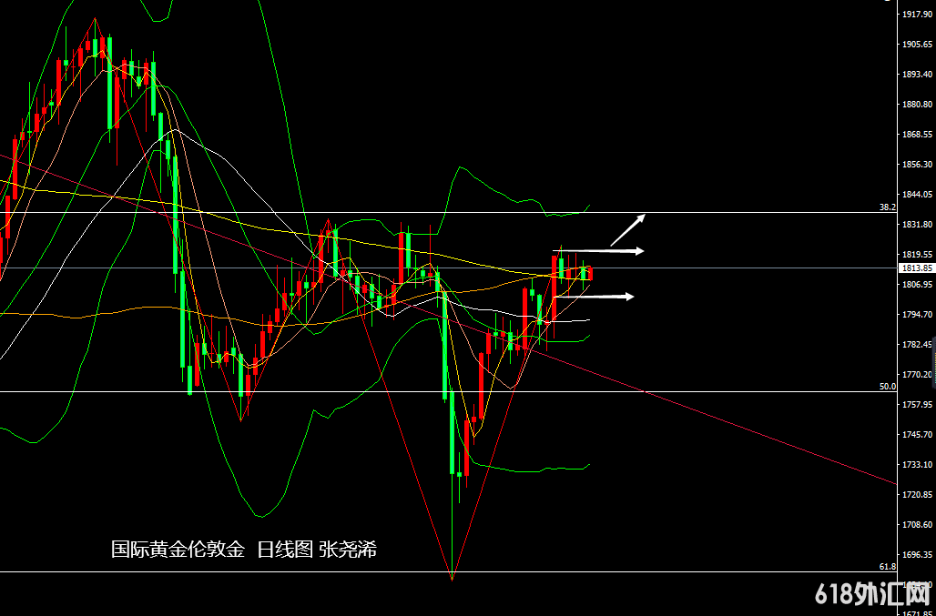 美盘时段,初请等数据利空,美债及美指借此走高反弹,金价加大回落,跌至1804.85美元日低点,不过,随后美债及美指再度回顾跌势回落,对其产生支撑,金价就此再度反弹至1813上方,符合给出的支撑看涨为主,并多单止盈,最终收于1809.37美元,日振幅12.01美元,收跌4.51美元,幅度0.25%。