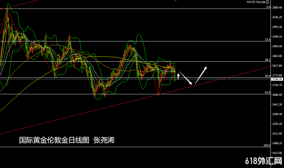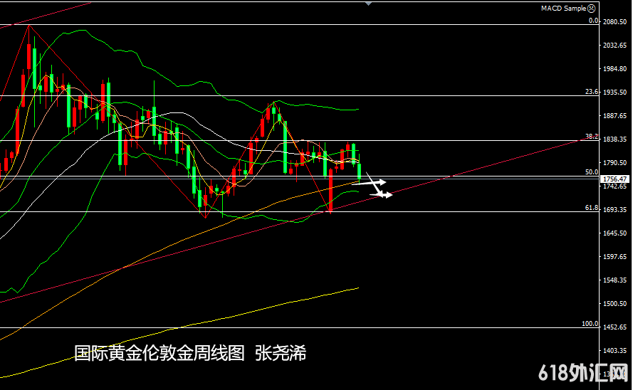 技术上:周线级别:金价本周反弹后遇阻回落,其力度在由阳转阴后,也跌破50%回撤线支撑,虽在触及100周均线有所止跌,但附图指标的KDJ及MACD空头信号依然增强,主图上,短期均线5-10等也持续造成压力,故此目前走盘,空头仍占据优势,但下方自1450美元而起的上升趋势线以及61.8%回撤线有着中长期的看涨预期和支撑力度,这也是我近期在文章中一直给出的支撑看涨位置,现在金价已经回落临近于此,继续耐心等待即可。什么时候触及,什么时候布局中长线多,至于隔夜挂单进场持有的1750美元多单,带好止损止盈作为试错单也无关紧要。