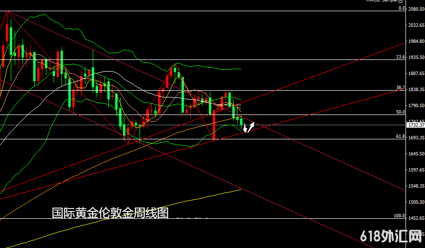 技术上:周线级别:金价本周目前继续走低,上方50%回撤线以及100周线对其产生明显压力,附图指标KDJ保持死叉看空信号,MACD绿色动能柱保持增强,主图上,短期均线也死叉看空,后市预有进一步回落触及布林带下轨附近的风险。在重回50%回撤线上方前,保持反弹做空,继续关注近期给出的支撑趋势线位置。具体点位下方参考1710美元或1690美元附近重点支撑。