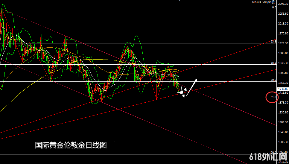 日线级别:金价周三反弹上穿5日线阻力后再度回落触及下轨支撑,近期走势都保持此模式运行,日内来看,下方仍有空间,不过KDJ则继续处于超卖位置,MACD动能柱也有持续缩减迹象,虽快慢线处于下行趋势中,但可以看出多头似乎也在寻找止跌机会,故此个人认为,下方的布林带下轨以及1450-1685连接的上升趋势线支撑位置将会有不错反弹,等待机会。同时如跌破,那么3月份的低点1676美元将是最后一道防线,跌破将看向1600美元附近或下方,但如支撑有效并回归反弹,则继续保持上看1900美元附近或上方。日内操作参考下方点位: