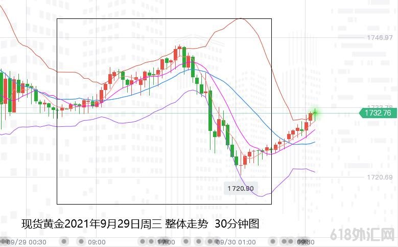 晚间美盘时段,市场愈发预期美联储将从11月开始减少资产购买规模,且信心不断增强。并可能在2022年末加息。这推动美元指数大幅反弹触及一年高位94.45,黄金则就此跌创近七周新低至1721.49美元/盎司,最终也由于技术支撑和美债回落的支撑,收于1726.30美元,日振幅23.73美元,收跌7.69美元,跌幅0.44%。