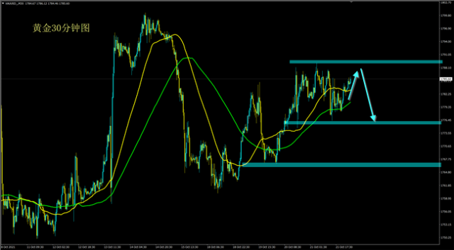 现货黄金昨日震荡上行晚间承压1785下跌压力,回踩1760支撑带,受美元回修影响而震荡回弹,周二冲高回落的走势暗示空头力量仍然强劲,短线多空双方可能继续陷入拉锯战。目前价格维持在1765-1785之间震荡,日线收得一带有长上影线的阳星线。中轨带来的支撑依旧存在,短期偏强震荡,本周美国方面并没有重要的经济数据公布,这意味着风险情绪将主导金价的走势。