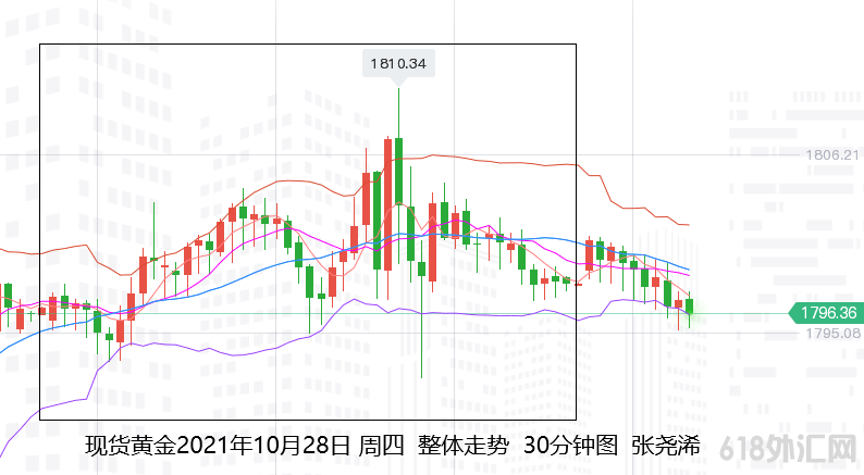 张尧浠:美GDP爆冷美元回落趋跌、黄金维持高位震荡偏弱 上交易日周四(10月28日):国际黄金伦敦金冲高回落且收阳。 走势上,金价自亚市早盘开于1796.78美元/盎司,短暂走低至1793美元后展开震荡反弹,周四的探底回升力量对其产生买盘支撑,虽亚盘尾及欧盘初,在美债收益率反弹的压力下,金价自1804回落至1795美元,但因持续走低的美元,多头又再度回归; 并延续至美盘初,欧洲央行行长拉加德的言论以及弱于预期的美国GDP经济报告,提振对黄金的需求,并在数单大量砸盘的较剧烈的跳动下,推动其录得日内高点1810.19美元,最后遇阻回落,美债10年期收益率加大反弹,金价下跌明显,刷新日内低点至1792.30美元,终有所反弹,微幅收涨于1798.66美元,且留下长上影线,日振幅17.89美元,收涨1.88美元,幅度0.11%。
