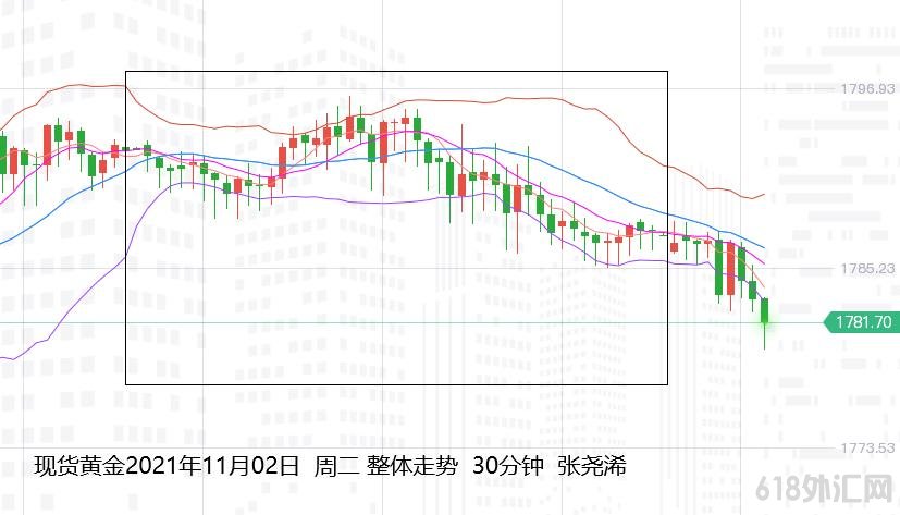 展望今日周三(11月03日):国际黄金开盘1787.76美元经过短暂承压盘整后,迅速走低至1780关口并持续承压,美指及美债早盘波幅甚小对其影响不大,隔夜美股市场再度刷新历史高点则产生较大压力,另外近期遇阻的回撤力量仍在产生卖盘需求。