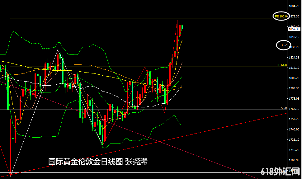 操作上,周图偏向逢低看涨,下方关注上轨附近支撑,暂参考1848美元,以及1836美元支撑;上方关注1870美元,以及1888美元阻力。