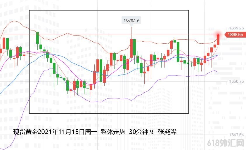 张尧浠:黄金动力暂歇仍偏涨、关注恐怖数据预期走势 上交易日周一(11月15日):国际黄金伦敦金虽探底回升刷新高点,但仍未突破阻力位,且最终仍收取阴线,增强了反弹遇阻的承压力度。 走势上,金价自亚市早盘小幅开于1867.95美元/盎司,即受到技术阻力而承压走低运行,延续到亚盘尾部时段录得日内低点1856.15美元,但因触及5日线支撑,以及欧洲央行决策官员的鸽派言论也助长了市场对该行在抗通胀方面落后于形势的猜测。这再度推动金价走高,并录得日内高点1869.84美元,但美指刷新近16个月高点至95.60,美债10年期收益率也大幅走高,则对其产生压力,终回落收于1864.71美元,日振幅13.69美元,相对开盘价收跌3.24美元,跌幅0.17%。