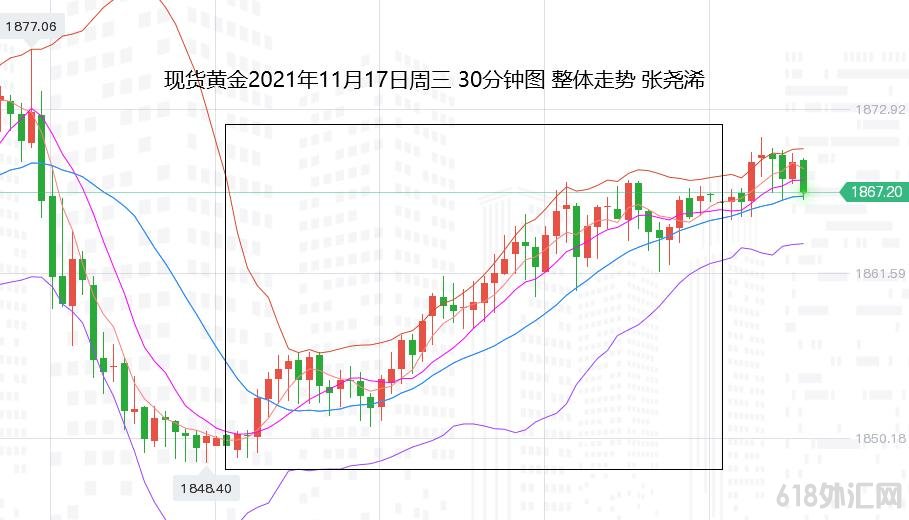 张尧浠:通胀担忧继续支撑买盘、黄金持强运行前景看涨 上交易日周三(11月17日):国际黄金伦敦金止步回落并较大幅反弹,转收阳。 走势上,金价自亚市早盘开于1849.83美元/盎司,受到基本面支撑以及高位震荡的买盘需求即止跌回升,并同时录得日内低点1849.41美元,虽在5日均线1857美元附近有所遇阻回撤至1850关口,但力度有限,多头再度获力反弹,因通胀担忧推动,美元指数从16个月高点回落,美债收益率下跌,并延续至美盘尾部时段录得日内高点1867.65美元,终收于1867.03美元,日振幅18.24美元,收涨17.2美元,幅度0.93%。