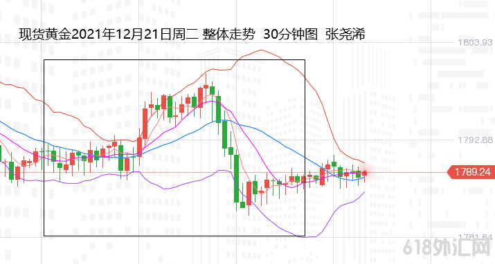 张尧浠:风险偏好避险遇挫、黄金关注短期震荡走弱 上交易日周二(12月21日):国际黄金伦敦金虽有冲高,但仍回落再度收阴。 走势上,金价自亚市开于1790.53美元/盎司,因市场避险情绪削弱,而美元和美股下跌有一定支撑,这使得整体处于1793-1788区间震荡,但延续到欧盘初,市场风险情绪改善提振澳元和英镑等风险较高货币,打压美指走低,推动金价先行走出上行,并至盘尾录得日内高点1799.97美元; 不过,随后美盘开盘后,市场再度忽视了奥密克戎变体带来的经济风险,投资者对高风险资产的兴趣有所回升,美元收复部分失地,美债收益率也大幅攀升,打压金价即走回落,且连续下行,于次日凌晨零点半录得日内低点1784.92美元,终有所止跌收于1788.76美元,日振幅15.05美元,收跌1.77美元,跌幅0.1%。