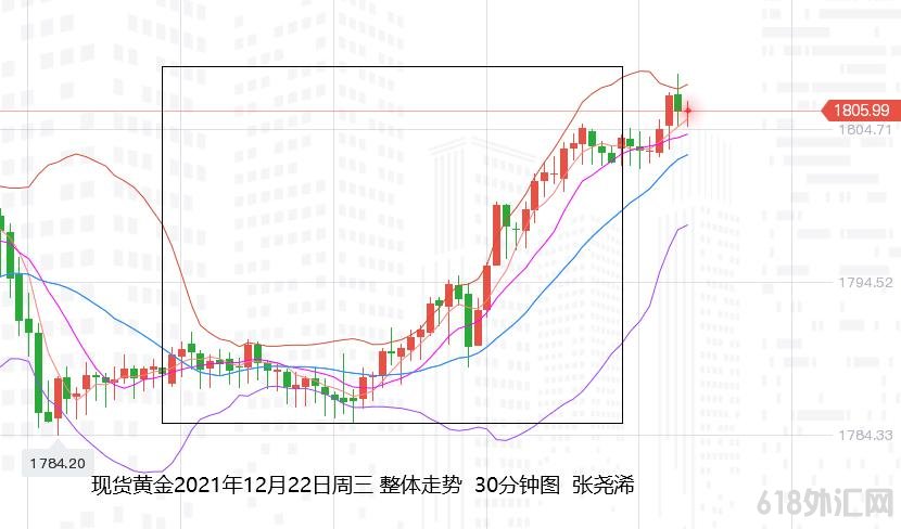 张尧浠:美指横向盘整、黄金关注1785-1813区间走势 上交易日周三(12月22日):国际黄金伦敦金止步遇阻回落,并较大幅回升收阳。 走势上,金价自亚市早盘开于1788.88美元/盎司,受到日图中轨附近的支撑便反弹至1790美元上方,但短期回落压力令走势有所遇阻,延续到盘尾触及日内低点1785.85美元; 不过,之后欧盘开盘,欧元、澳元和其他货币兑美元反弹,推动美指走弱,提振金价就此展开反弹,再加上人们对奥密克戎变体可能阻碍全球经济复苏的担忧挥之不去,日内美元避险需求持续遭到打压; 并推动金价一路至美盘尾触及日内高点1804.73美元,终收于1803.39美元,日振幅18.88美元,收涨14.51美元,涨幅0.81%。