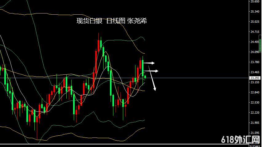 现货白银:银价隔夜收跌2.02%,至23.354美元;虽目前受到中轨及10日均线等支撑有所止跌,但指标信号已经转弱,仍有进一步回落预期和空间;