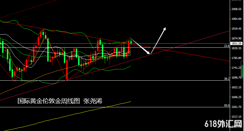 周线级别:金价本周在进一步走强冲击布林带上轨之外后展开明显回落,并再度回撤至趋势线附近,暂时有一定的支撑力度,但上方的较长上影线,增强了短期的看跌预期,不排除会延续回落,如本周不能再度刷新高点,不管本周收线如何,下周都将继续走出回落。下方关注38.2%回撤线支撑,以及5周均线支撑。上方则关注布林带上轨附近阻力。