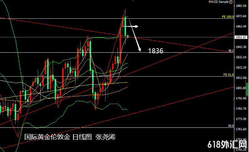 技术上:月图级别,金价在测试斐波拉契扩展线的100线位置后走出回落,但其保持的力度仍显较强,附图指标MACD空头动能持续减弱,虽双线并不是处于0轴下方,也有走强预期,如再度走弱,顶多预计也将是保持横向盘整局面。大方向上仍将是上行。下方将关注38.2%回撤线支撑的1836美元支撑,以及中轨一线的1827美元附近。触及可再度看涨。