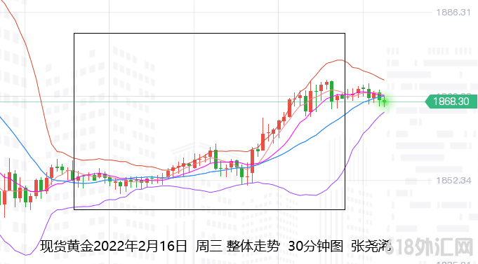 但美盘开盘后,金价又再度走强,美元指数继续走出回落,美联储1月会议记录没有表明政策制定者会像投资者担心的那样鹰派而减弱了加息力度,同时美国表示俄罗斯仍在乌克兰周围集结军队助推避险情绪,黄金价格就此应声上涨,并力度有所加大,于盘尾录得日内高点1872.23美元,最终有所遇阻,收于1869.31美元,日振幅22.08美元,收涨15.88美元,涨幅0.86%。