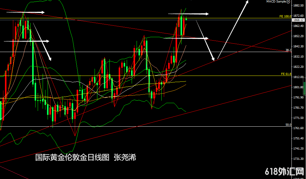 重点而言,上方继续关注目前高点1880美元附近,以及1900美元附近阻力;下方关注38.2%回撤线支撑的1836美元支撑,以及中轨一线的1827美元附近。在此上方保持长期看涨。