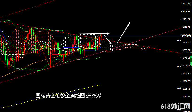 周线级别:金价目标处于震荡走强的形态,附图指标KDJ以及MACD仍保持金叉的看涨信号,暗示金价仍有继续走强的风险和预期。不过主图则有反弹触顶的信号,随时有回落的需求,但下方支撑众多,回落也将是有限的。具体而言,上方关注本周目前高点阻力,下方继续关注38.2%回撤线支撑,进行周图的多空操作。