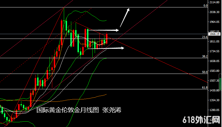 技术上:月图级别,金价隔夜反弹,再度测试斐波拉契扩展线的100线位置阻力,在突破前,仍有回落需求,如本月突破运行,则进一步看至1900美元或1930美元的目标阻力,但长期而言,也打开了加大的上方空间,并有重启牛市的风险。如本月不能重回1836美元一线或下方,则有保持震荡的预期,并至下半年打开方向性的走势。