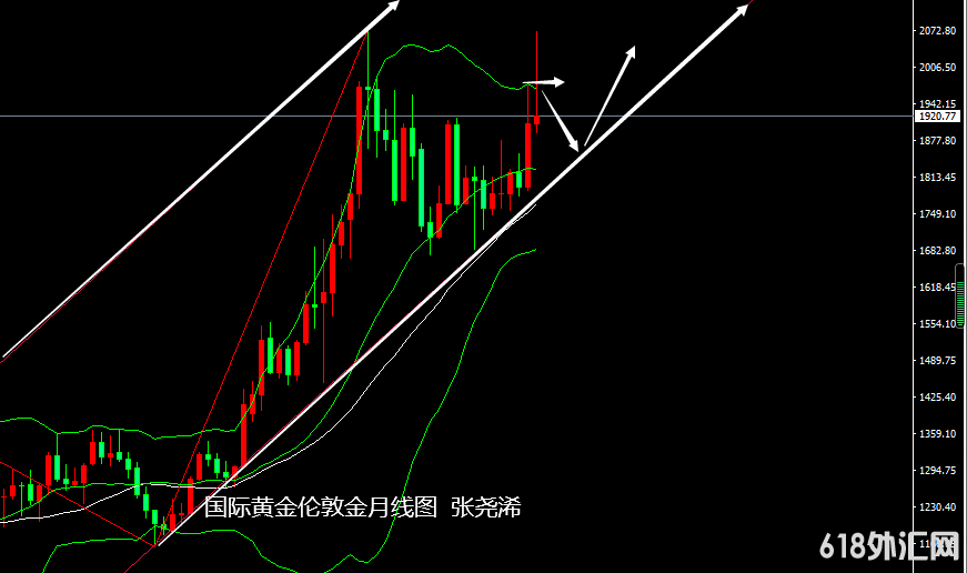 技术上:月图级别,金价本月大幅冲高转走回落,几乎要收复全部涨幅,力度上,上方的巨长上影线增强了目前的看空力度,不排除仍有进一步走低的风险。