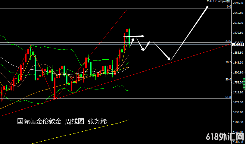周线级别:金价本周已延续上周的射击之星看空形态大幅回落走低,附图指标信号整体已转为看空,主图走势也跌破5周均线支撑,将进一步看跌至10周均线位置的1880美元,上方5周均线以及上轨线则转为阻力,触及可看空入场。