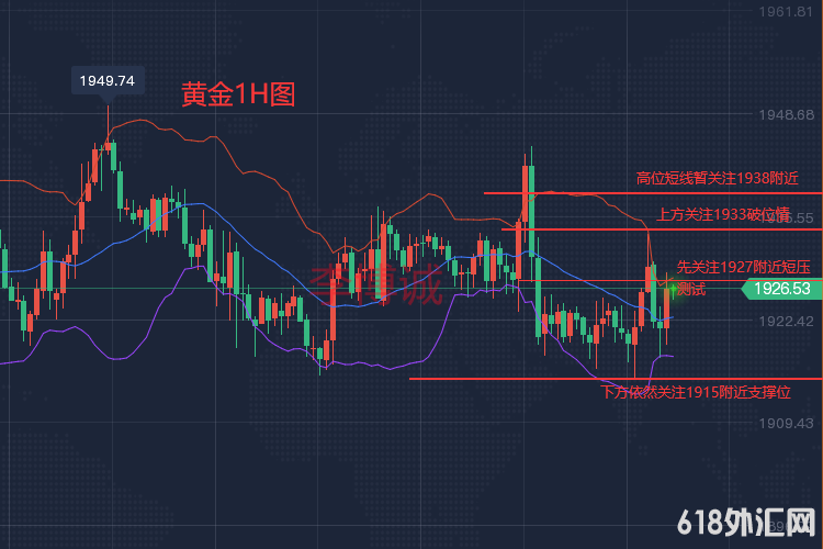结合目前日线以及小时图状态,技术上黄金还是有进一步下修可能的,晚间上方继续关注5日线1927附近短压测试,主要压力依旧看10日线1933以及20日线1938附近压力测试,但凡只要行情未站上20日线之上,那么技术上就存在看调整的预期和条件。晚间下方继续还是关注近期的争夺低点1915附近测试,一旦此位有效失守,则行情回撤1910甚至1905-00区域将会成为可能。