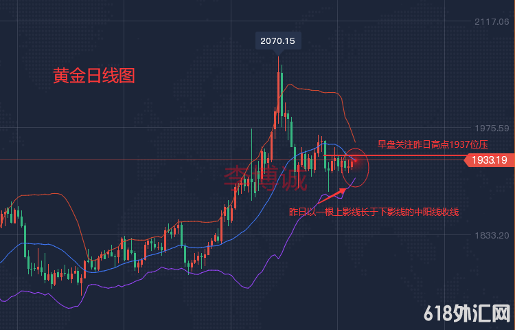 昨日黄金市场早盘开盘在1923.3的位置后行情先回落给出1920.3的位置后行情震荡拉升,美盘时段行情最高触及到了1937.9的位置后行情遇阻整理,日线最终收线在了1931.5的位置后行情以一根上影线长于下影线的中阳线收线,而这样的形态收尾后,今日的行情延续区间。