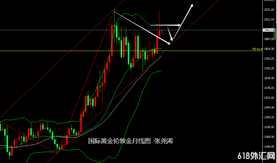 周线级别:金价近期保持在自2070美元而下的长上影线压力中,不过走势则处于多空交错的震荡模式之中,存在一定的回落需求,中轨线位置或100周均线位置仍需看涨关注的入场位置。