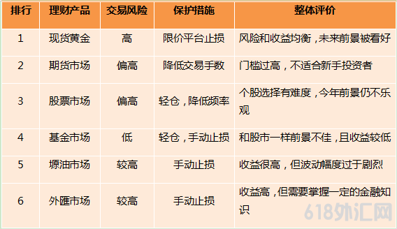 通过六种市面上常见的理财产品风险比较过后,我们可以发现除了基金以外,其它都属于高风险高回报的类型,而其中原油和外汇都有着难以控制的风险,所以只适合非常激进的朋友,而股票目前还看不到有利的资讯,今年恐怕还不是最好的入市时机,至于期货的局限性则是在需要高达3万元以上的门槛,因此现货黄金在这份榜单当中成功脱颖而出。