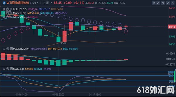 【 原油消息面解析】:周二(4月16日)美盘时段,美原油窄幅震荡,目前交投于85.2美元/桶。美原油周一上涨0.35%,收报85.63美元/桶。6月交割的布伦特原油期货结算价报每桶90.10美元,下跌0.35美元,跌幅0.4%。5月交割的美国原油期货下跌0.25美元,或0.3%,收报每桶85.41美元。美元指数持续走高,偏向压制油价。短线来看,油价后市走势变数较大,上周五的长上影线暗示上方阻力较强,周一的长下影线暗示下方存在较强的逢低买盘,市场情绪波动也比较大,美原油建议关注84.03-87.61区域突破情况。考虑到MACD死叉运行,KDJ死叉运行,后市短线略微偏向震荡下行。
