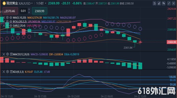 【黄金消息面解析 】:周一(4月22日)亚市,现货黄金震荡下跌,最低触及2361.98美元/盎司,较上周五收盘价下跌近30美元,因市场对中东冲突升级的担忧情绪降温,而美国国债收益率走高给美元计价的黄金带来压力。美债10年期收益率周图保持布林带向上扩散,均线支撑,及附图指标信号都偏向多头看涨,将会进一步反弹触及5%位置,月图则看涨动力加强,布林带处于展现看涨前景,暗示后市将有超过5%位置之上,将会限制金价多头动力,因而,短期走势,金价偏向震荡待回落的预期。周末市场表现平淡,没有什么重点消息公布,黄金开盘走出小幅下跌,并且目前下跌力度还没有走完,按照现在的表现来看,亚盘还有低点出现,从大局观来看,黄金在多头趋势下走高位震荡,不看好本周会有新高,反而一定要谨防会走出大跌空间。因此,在趋势没有变的情况下,尽量保持低多,在震荡区间明显的情况下,可以做高空低多。周内关注强弱关键点2360的得失,关注2318趋势点的得失,如果跌破2360.黄金则从极强转弱,跌破2318则从多头转为空头,那么,后市再看大跌空间至2250.